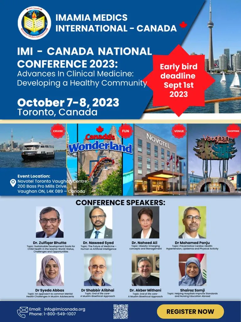 Imamia Medics International Canada (IMI) is holding its Canadian National Conference as an in-person meeting on Saturday October 7-8th, in Toronto at the Novotel Toronto Vaughan Centre. The conference will cover all aspects of medicine that affect our community including Global health and Child mortality, End of life care, Mental health in our youth, Artificial Intelligence in Healthcare and many others. We have many amazing speakers, including internationally renowned keynote speakers Dr. Zulfiqar Bhutta and Dr Naweed Syed. This event will attract attendees from Medical Doctors, Allied Health Professionals, Researchers, Students and Industry leaders from within, and outside Canada. The conference has been designed to engage all; we encourage you to attend with your family. IMI Canada’s CME program team has worked extensively to create a program that will engage all specialties, and create value for all who attend.