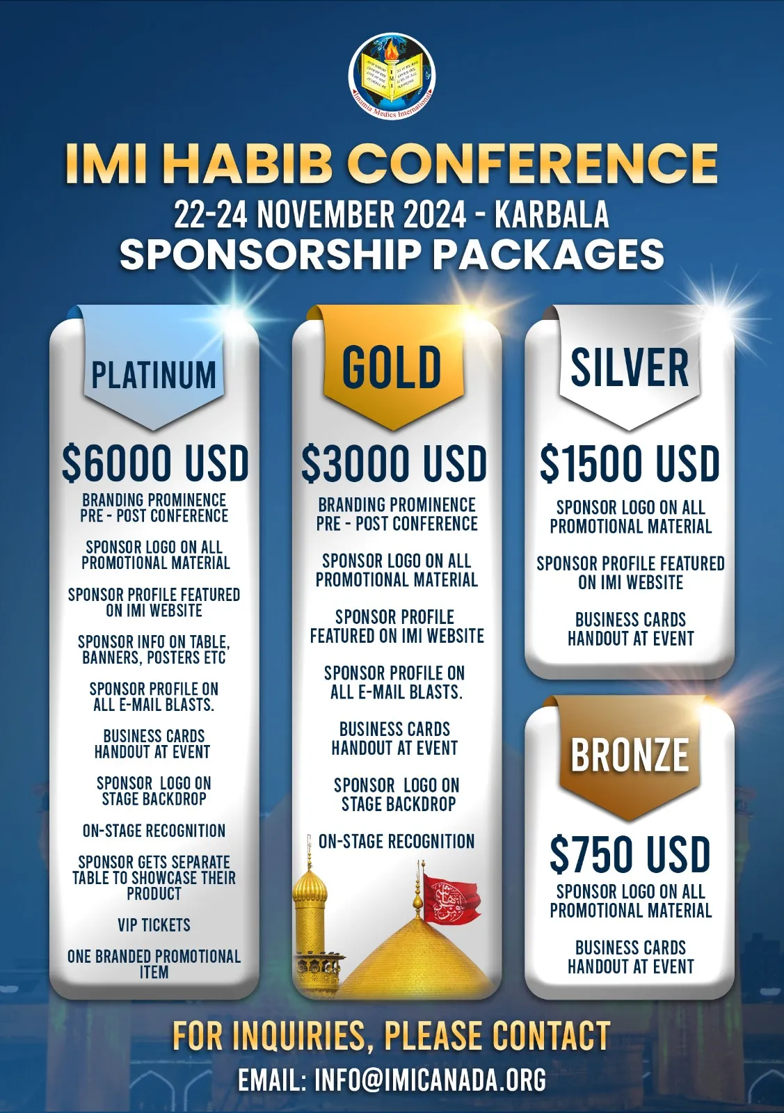 Imamia Medics International Canada (IMI Canada) will be hosting its next Continuing Medical Education Conference, the H.A.B.I.B. Conference, on the Holy Land of Karbala from Friday November 22nd to Sunday November 24th, 2024.